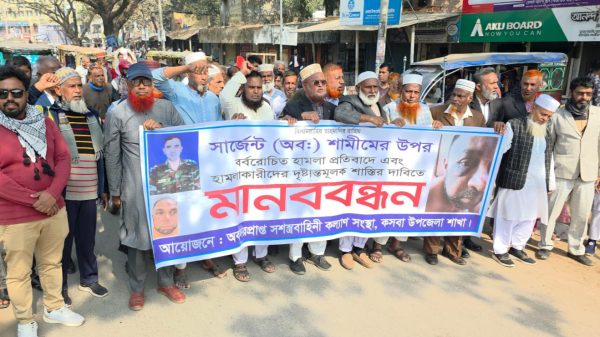 কসবায় অবসরপ্রাপ্ত সেনাসদস্যের উপর মাদক ব্যবসায়ীদের হামলা। প্রতিবাদে মানববন্ধন ও বিক্ষোভ মিছিল